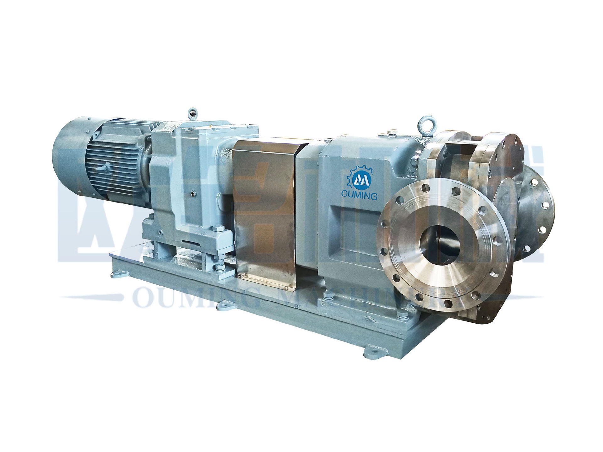 該產(chǎn)品借助于工作腔里的多個(gè)固定容積輸送單位的周期性轉(zhuǎn)化來達(dá)到輸送流體的目的。原動(dòng)機(jī)的機(jī)械能通過泵直接轉(zhuǎn)化為輸送流體的壓力能,泵的流量只取決于工作腔容積變化值以及其在單位時(shí)間內(nèi)的變化頻率,而(理論上)與排出壓力無關(guān);轉(zhuǎn)子泵依靠?jī)蓚€(gè)同步反向轉(zhuǎn)動(dòng)的轉(zhuǎn)子(轉(zhuǎn)子葉數(shù)為2-8)在旋轉(zhuǎn)過程中于進(jìn)料口處產(chǎn)生吸力(真空度),兩轉(zhuǎn)子將轉(zhuǎn)子室分隔成幾個(gè)小空間,在傳動(dòng)軸的帶動(dòng)下進(jìn)行反方向旋轉(zhuǎn),介質(zhì)即被輸送至出料口,從而產(chǎn)生了較高的排放壓力,如此往復(fù)循環(huán),特別適合中高粘度介質(zhì)的輸送。