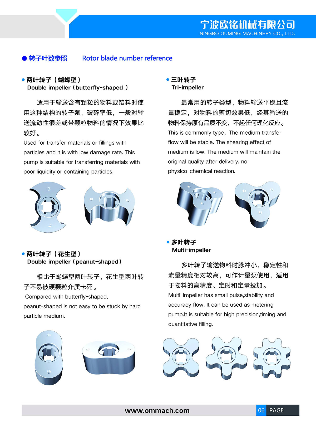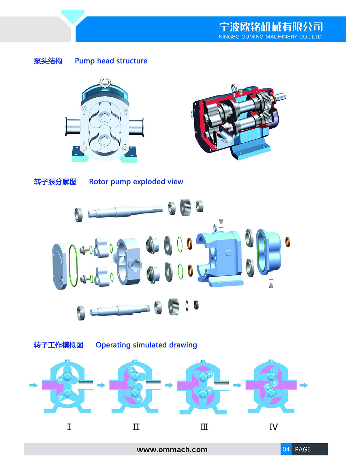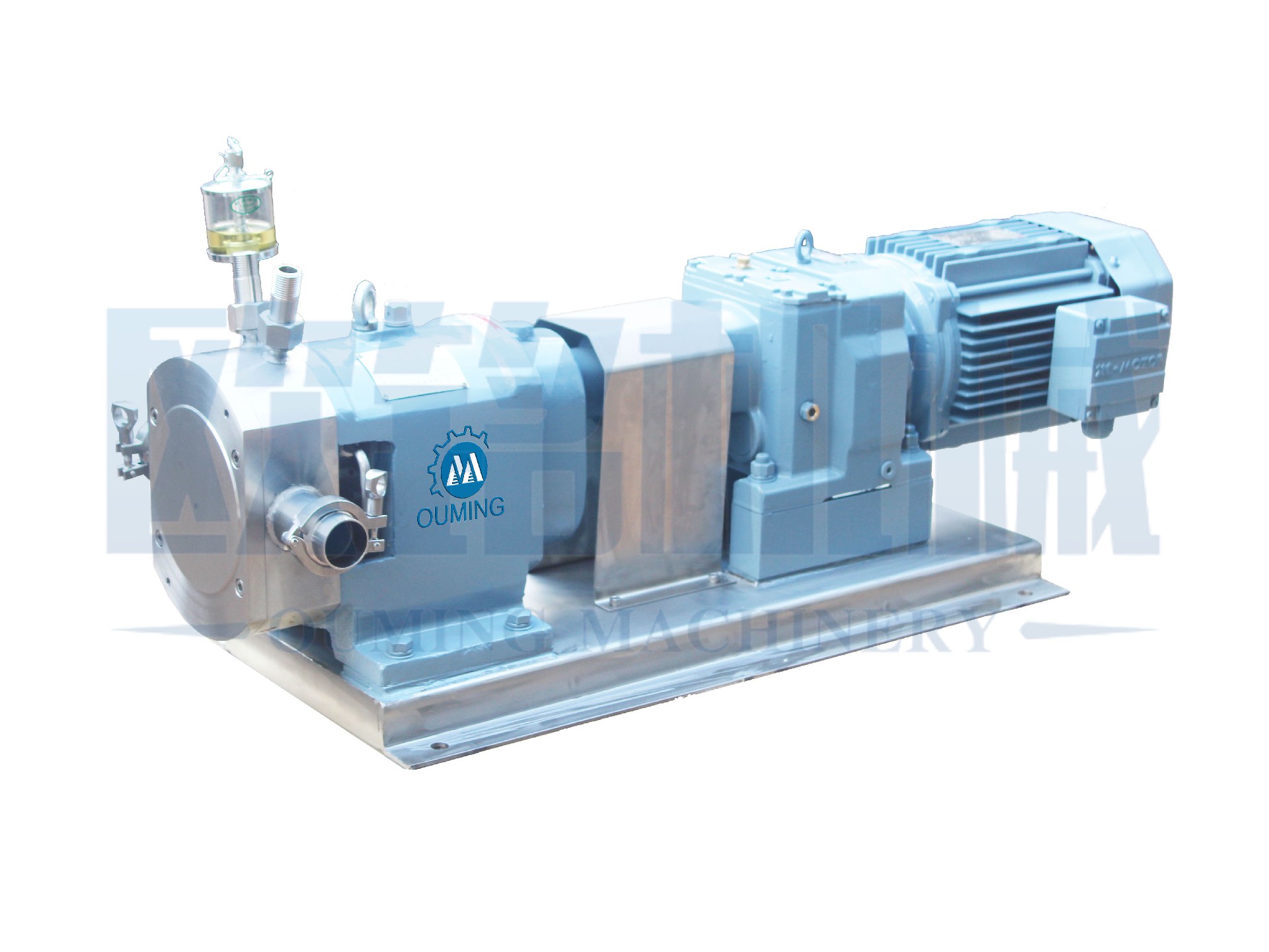 該產(chǎn)品借助于工作腔里的多個(gè)固定容積輸送單位的周期性轉(zhuǎn)化來達(dá)到輸送流體的目的。原動(dòng)機(jī)的機(jī)械能通過泵直接轉(zhuǎn)化為輸送流體的壓力能,泵的流量只取決于工作腔容積變化值以及其在單位時(shí)間內(nèi)的變化頻率,而(理論上)與排出壓力無關(guān);轉(zhuǎn)子泵依靠?jī)蓚€(gè)同步反向轉(zhuǎn)動(dòng)的轉(zhuǎn)子(轉(zhuǎn)子葉數(shù)為2-8)在旋轉(zhuǎn)過程中于進(jìn)料口處產(chǎn)生吸力(真空度),兩轉(zhuǎn)子將轉(zhuǎn)子室分隔成幾個(gè)小空間,在傳動(dòng)軸的帶動(dòng)下進(jìn)行反方向旋轉(zhuǎn),介質(zhì)即被輸送至出料口,從而產(chǎn)生了較高的排放壓力,如此往復(fù)循環(huán),特別適合中高粘度介質(zhì)的輸送。