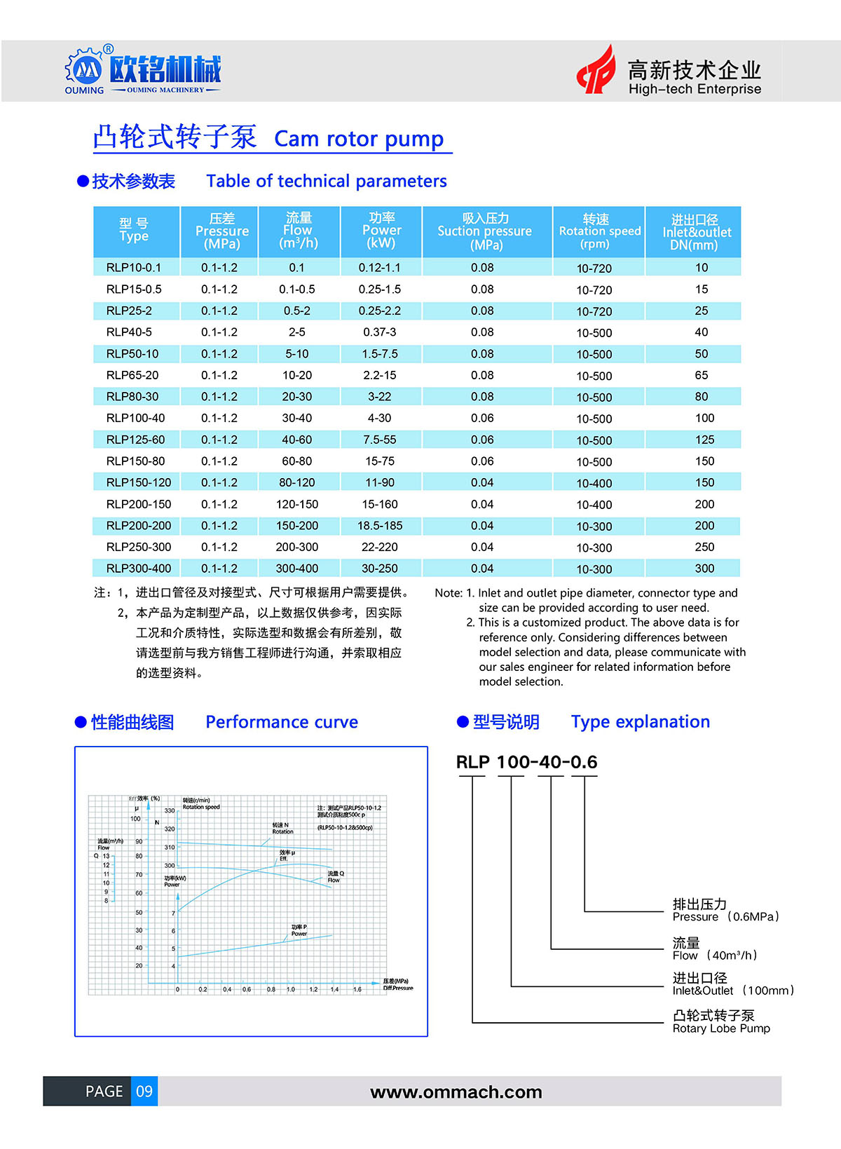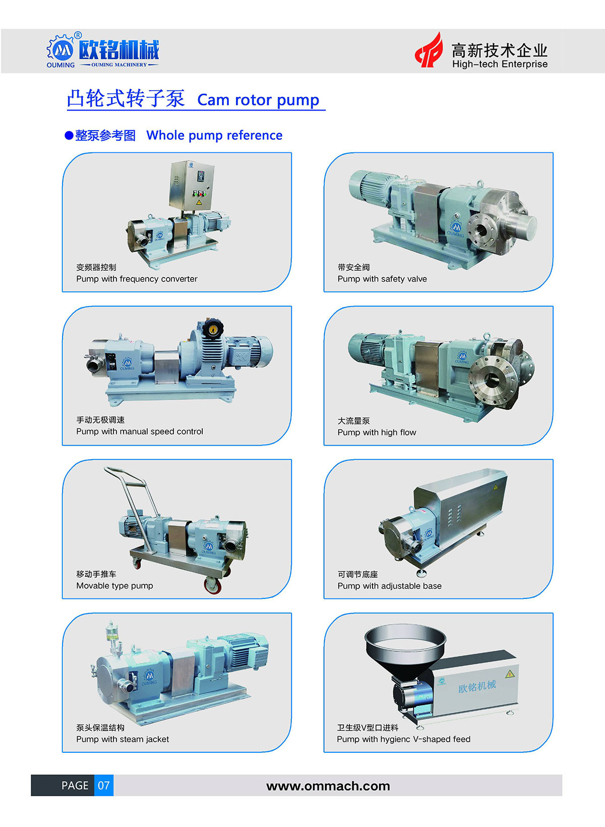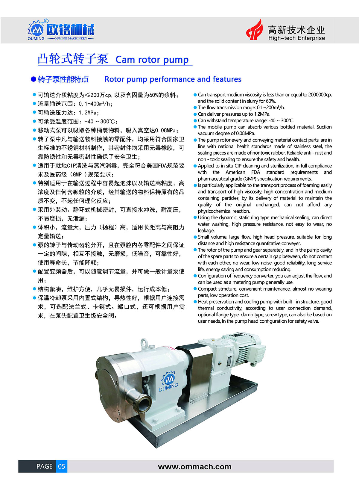 該產(chǎn)品借助于工作腔里的多個(gè)固定容積輸送單位的周期性轉(zhuǎn)化來達(dá)到輸送流體的目的。原動(dòng)機(jī)的機(jī)械能通過泵直接轉(zhuǎn)化為輸送流體的壓力能,泵的流量只取決于工作腔容積變化值以及其在單位時(shí)間內(nèi)的變化頻率,而(理論上)與排出壓力無關(guān);轉(zhuǎn)子泵依靠?jī)蓚€(gè)同步反向轉(zhuǎn)動(dòng)的轉(zhuǎn)子(轉(zhuǎn)子葉數(shù)為2-8)在旋轉(zhuǎn)過程中于進(jìn)料口處產(chǎn)生吸力(真空度),兩轉(zhuǎn)子將轉(zhuǎn)子室分隔成幾個(gè)小空間,在傳動(dòng)軸的帶動(dòng)下進(jìn)行反方向旋轉(zhuǎn),介質(zhì)即被輸送至出料口,從而產(chǎn)生了較高的排放壓力,如此往復(fù)循環(huán),特別適合中高粘度介質(zhì)的輸送。