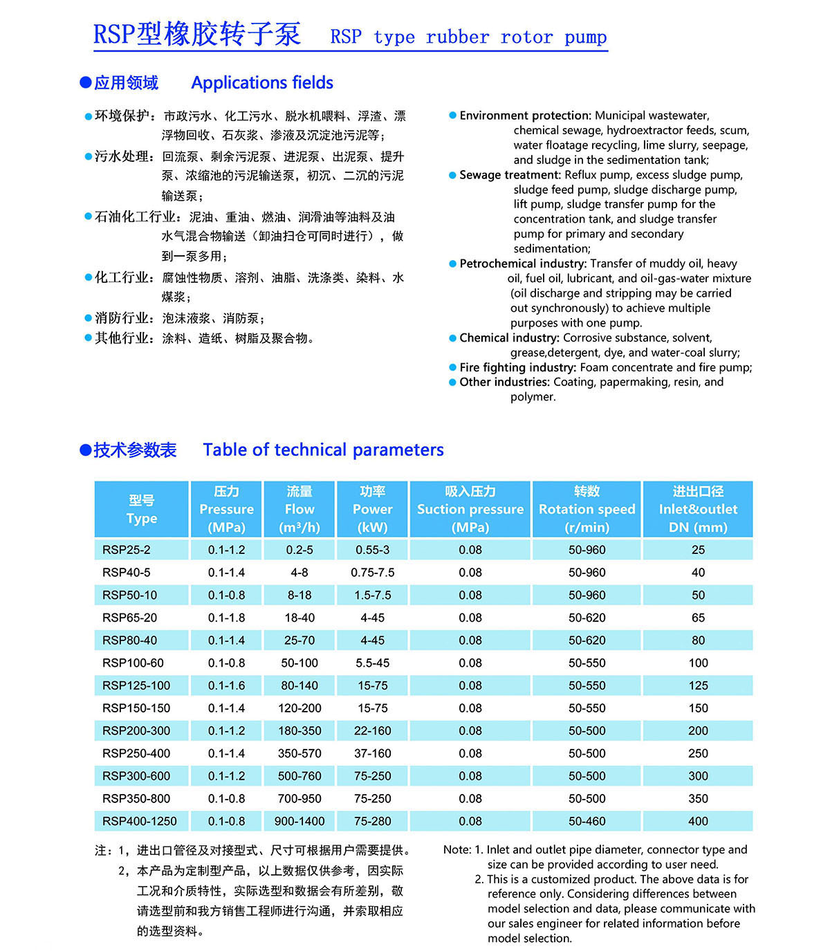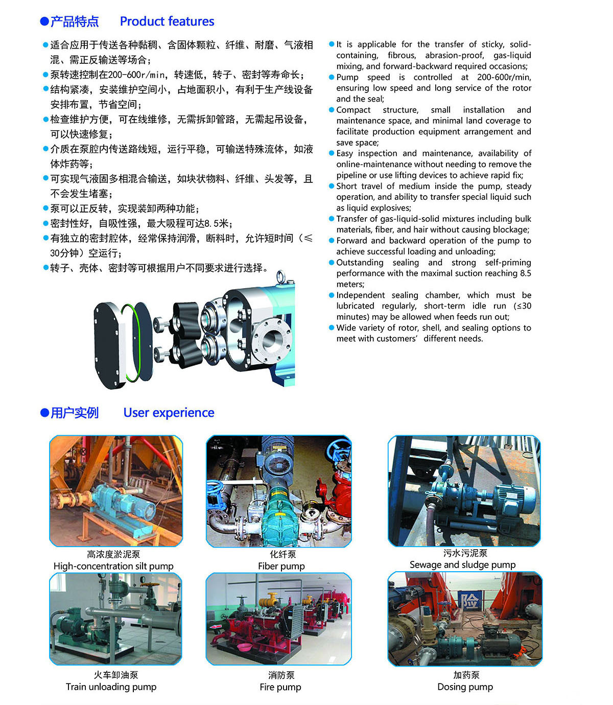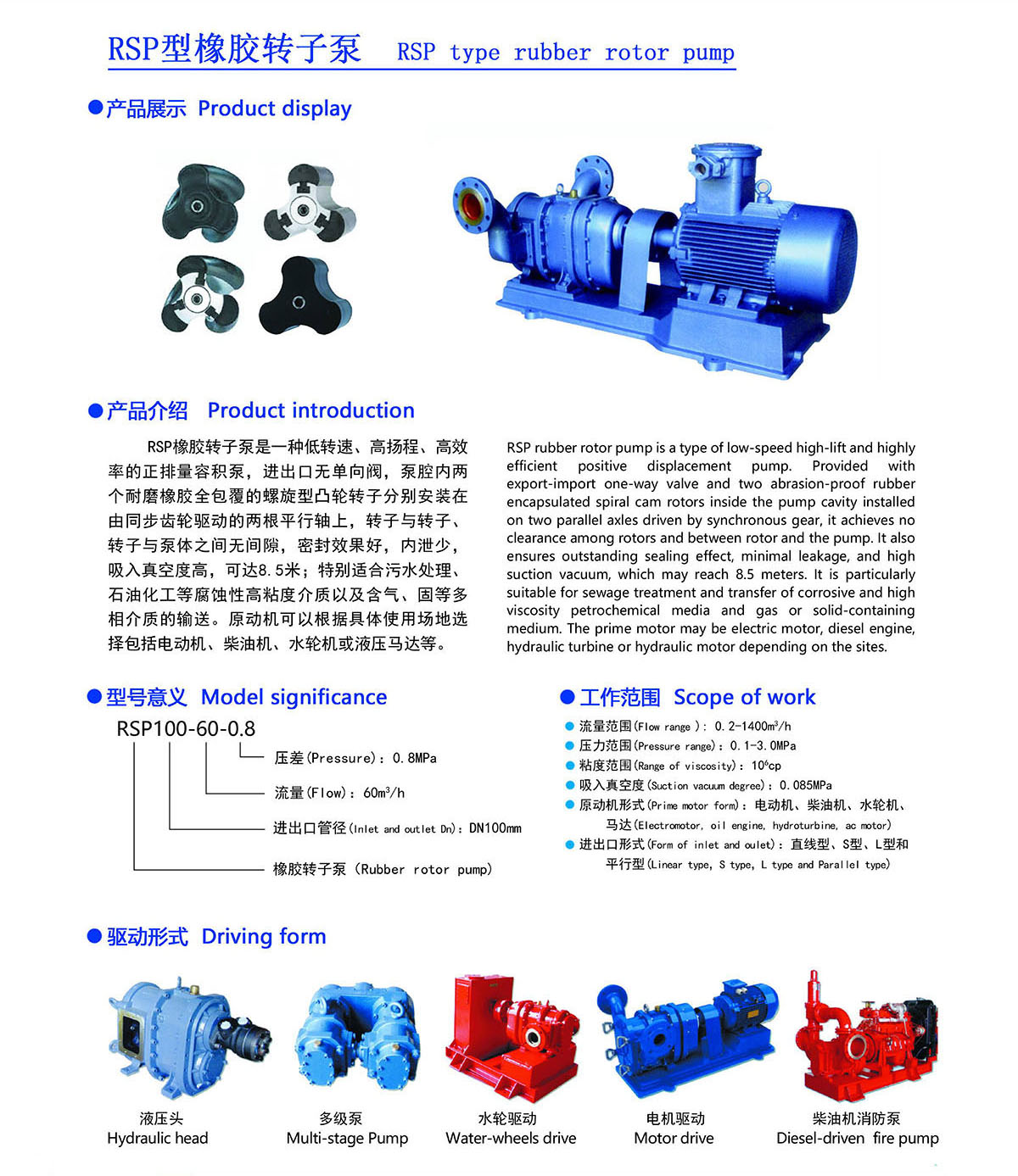 RSP橡膠轉(zhuǎn)子泵是一種低轉(zhuǎn)速、高揚(yáng)程、高效率的正排量容積泵,進(jìn)出口無單向閥,泵腔內(nèi)兩個耐磨橡膠全包覆的螺旋型凸輪轉(zhuǎn)子分別安裝在由同步齒輪驅(qū)動的兩根平行軸上,轉(zhuǎn)子與轉(zhuǎn)子、轉(zhuǎn)子與泵體之間無間隙,密封效果好,內(nèi)泄少,吸入真空度高,可達(dá)8.5米;特別適合污水處理、石油化工等腐蝕性高粘度介質(zhì)以及含氣、固等多相介質(zhì)的輸送。原動機(jī)可以根據(jù)具體使用場地選擇包括電動機(jī)、柴油機(jī)、水輪機(jī)或液壓馬達(dá)等。